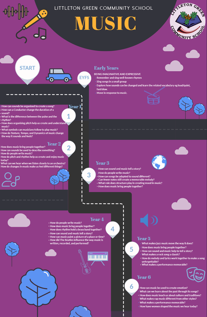 “As Music lead, my vision is that every child is encouraged to explore and develop their own unique appreciation of Music with an understanding of culture, history, musicians, emotions and feelings, styles and techniques.
